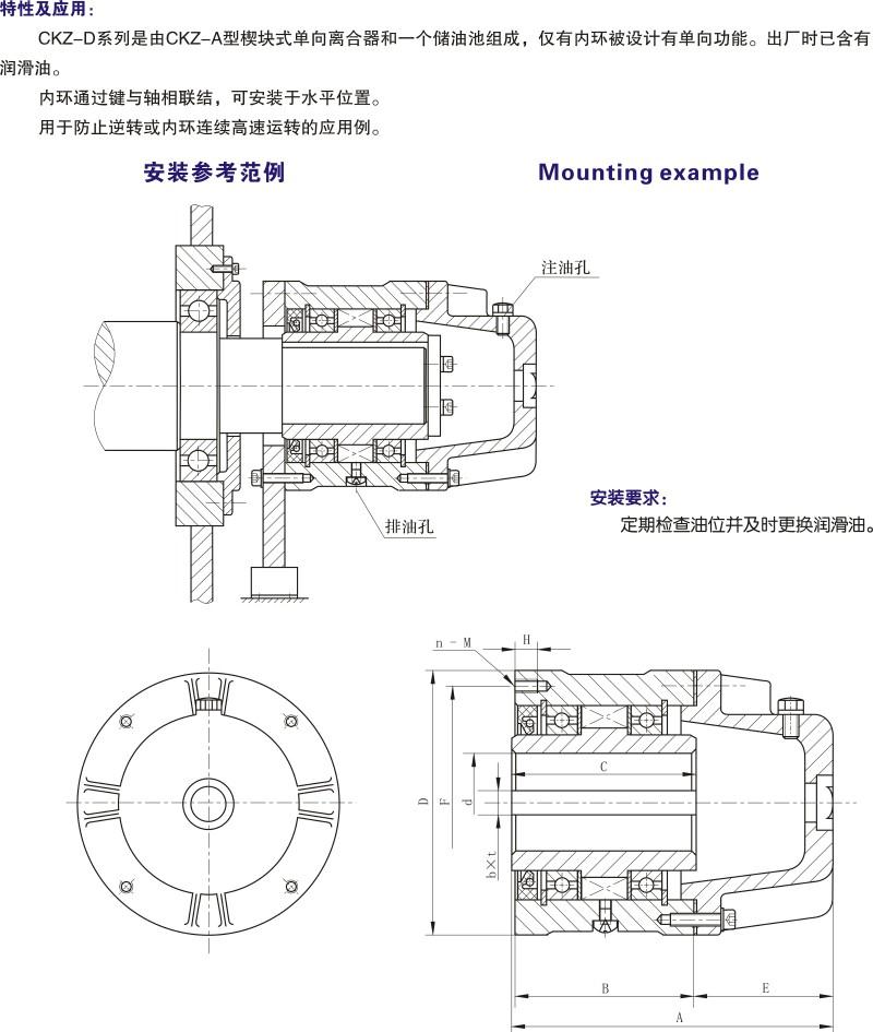 產(chǎn)品描述:CKZ-D系列是由CKZ-A型楔塊式單向離合器和一個(gè)儲(chǔ)油池組成,僅有內(nèi)環(huán)被設(shè)計(jì)有單向功能。