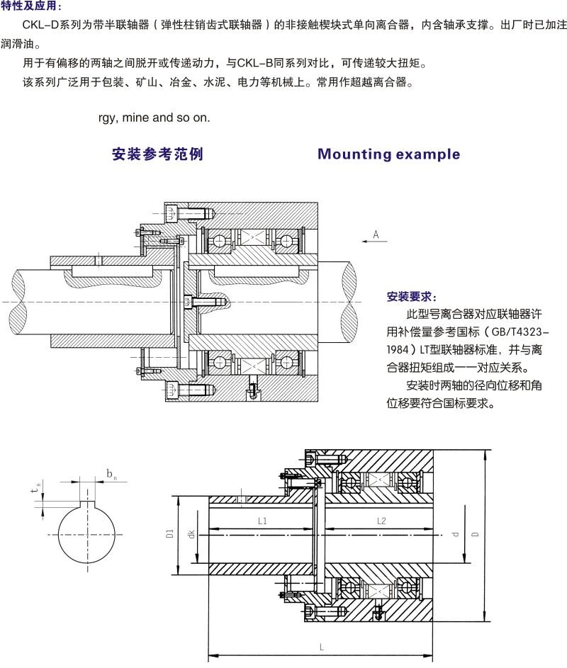 產(chǎn)品描述:CKL-D為帶半聯(lián)軸器(彈性柱銷齒式聯(lián)軸器)的非接觸楔塊式單向離合器。